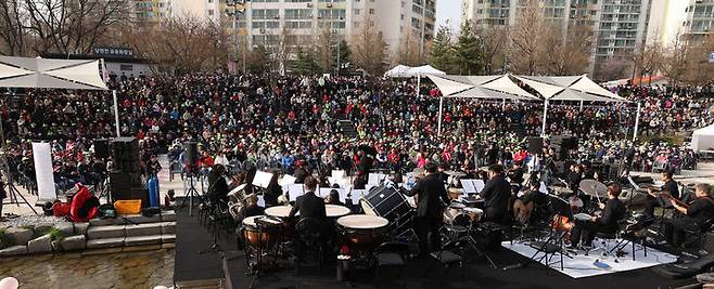 [서울=뉴시스] 조수정 기자 = 30일 오후 서울 노원구 한국성서대학교 옆 당현천 바닥분수 일원에서 열린 ‘2024년 당현천 벚꽃음악회’에서 지역 주민 등이 공연을 관람하고 있다. (사진=노원구 제공) 2024.03.31. photo@newsis.com *재판매 및 DB 금지