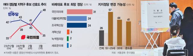 서울경제신문이 한국갤럽에 의뢰해 3월 28~29일 전국 만 18세 이상 남녀 1011명을 대상으로 진행, 31일 발표한 정당별 지역구 후보 선호도 조사에서 ‘민주당 후보에게 투표하겠다’는 응답은 48%로 집계됐다. 한 달 전 실시된 정례 조사보다 8%포인트 오른 수치다.