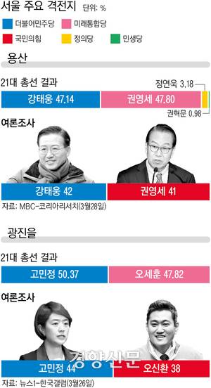 전문가들과 양당이 모두 승부처로 꼽는 지역은 ‘한강 벨트’다. 동작을에선 류삼영 민주당 후보와 나경원 전 의원이 맞붙는다. 21대 총선에서 이수진 민주당 의원이 52.16%의 득표율로 나 전 의원을 꺾은 바 있다. 하지만 지난 29일 KBS가 한국리서치에 의뢰해 발표한 조사에선 나 전 의원이 49%, 류 후보가 41.0%로 조사됐다. 용산은 지난 총선에서도 치열했다. 권영세 국민의힘 의원과 강태용 민주당 후보가 ‘리바이벌’ 매치를 치른다. 21대 총선에선 두 후보의 격차는 0.66%포인트 차이에 불과했다. 당시에는 정의당의 정연욱 후보가 3.18%를 득표한 바도 있다. 지난 28일 MBC가 코리아리서치에 의뢰해 발표한 조사에선 강 후보가 42%, 권 의원이 41%로 조사됐다. 두 지역 모두 지난 총선과 최근 여론조사가 다른 결과를 나타내는 셈이다.