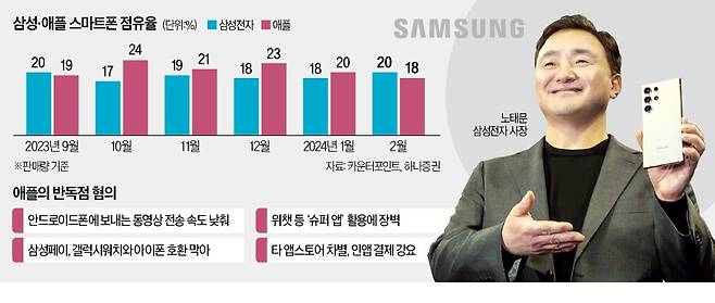 삼성전자가 애플을 제치고 5개월 만에 스마트폰 판매량 세계 1위 자리를 되찾았다. 갤럭시S24 시리즈 등 삼성이 세계 최초로 내놓은 ‘인공지능(AI)폰’이 북미 시장에서 호평받은 덕분이다. 전작 대비 판매량이 증가한 갤럭시 Z폴드·플립5 등 최신 폴더블 스마트폰도 1위 탈환에 힘을 보탰다. 삼성은 라이벌 애플이 반(反)독점 소송 등으로 코너에 몰린 지금이 프리미엄 스마트폰 시장에서 세(勢)를 불릴 절호의 기회로 보고 공격적인 마케팅을 펼친다는 구상이다.