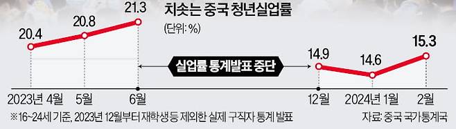 중국이 소비 부진, 부동산 침체 등 최악 수준의 경제위기를 겪으면서 청년 일자리 문제로 사회적 혼란에 빠질 것이라는 우려가 나온다. 매년 1000만 명이 넘는 대학 졸업생 중 수백만 명이 직장을 구하지 못하는 것으로 추산되고 있기 때문이다. ‘집단 우울증’에 빠진 중국 청년 세대가 느끼는 무기력함은 ‘탕핑’(평평하게 누워 있기)이라는 자조적 표현으로 표출될 정도다.