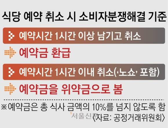 공정거래위원회는 소비자분쟁해결 기준을 통해 식당 등 외식서비스업체가 예약금을 요구할 때는 총 식사 비용의 10%를 넘지 않도록 권고한다. 또 예약 시간을 1시간 이상 남기고 취소한 경우엔 예약금을 다시 돌려주도록 하고 있다. 하지만 강제력이 없기에 이를 따르는 식당은 많지 않다.
