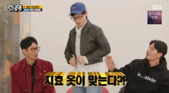 하지만 유재석은 송지효의 옷을 입었고, 몸무게가 48kg으로 알려진 송지효의 옷 사이즈가 찰떡같이 맞았다. 이에 멤버들은 "이게 맞아?" "심지어 힙해"라면서 모두가 깜짝 놀랐다.