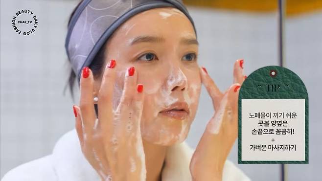채정안은 젤을 이용해 쫀쫀한 거품을 만들어내며 세안의 중요성을 언급하며 “쫀쫀한 거품이 미세한 부분까지 깨끗이 세안해줘 피부를 더 꼼꼼하게 관리할 수 있다”고 설명했다.