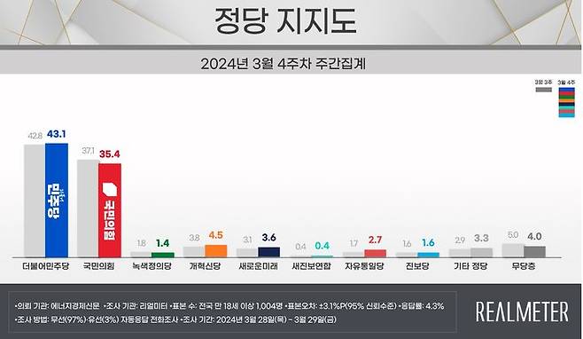 여론조사 전문기관 리얼미터가 에너지경제신문 의뢰로 지난달 28일~29일 이틀간 전국 18세 이상 유권자 1004명을 대상으로 정당 지지도를 조사한 결과, 국민의힘은 전주 대비 1.7%p 내린 35.4%, 민주당은 0.3%p 오른 43.1%로 집계됐다.
