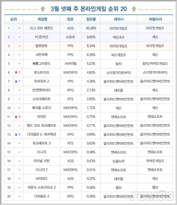 3월 넷째 주 온라인 게임 이용시간 순위에선 '로스트아크'의 상승세가 돋보였다.