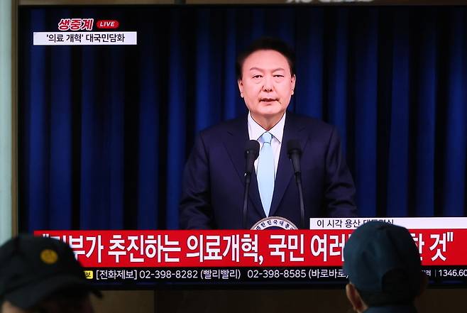 [1일 오전 서울역 대합실에서 시민들이 의료 개혁과 관련한 윤석열 대통령의 대국민 담화를 텔레비전을 통해 지켜보고 있다. (사진=연합뉴스)]