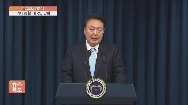 윤 대통령은 오전 용산 대통령실에서 진행한 '의대 증원·의료 개혁, 국민께 드리는 말씀'에서 이같이 말하며 "의료계가 증원 규모를 2천 명에서 줄여야 한다고 주장하려면, 집단행동이 아니라, 확실한 과학적 근거를 가지고 통일된 안을 정부에 제시해야 마땅하다"고 강조했습니다.