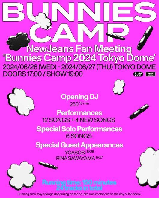 소속사 어도어(ADOR)는 지난 달 30일 공식 SNS를 통해 오는 6월 26~27일 도쿄돔에서 열리는 뉴진스(민지, 하니, 다니엘, 해린, 혜인)의 두 번째 팬미팅 ‘Bunnies Camp 2024 Tokyo Dome’ 상세 정보의 일부를 공개했다. 이에 따르면 뉴진스는 도쿄 팬미팅에서 지금까지 발표한 3장의 앨범에 수록된 전곡(12곡) 및 5월, 6월에 공개되는 신곡(4곡) 무대를 모두 선보인다. 여기에 특별한 솔로(6곡) 무대까지 150분 간 총 24곡의 향연이 펼쳐진다.