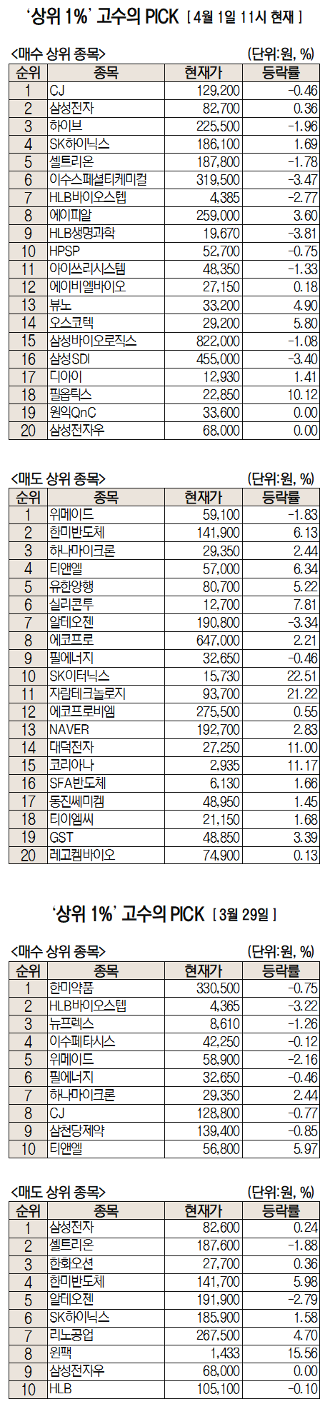 미래에셋증권은 자사 고객 중에서 지난 1개월간 수익률 상위 1% 투자자들의 매매 종목을 집계해 실시간·전일·최근 5일 기준으로 모바일트레이딩시스템(MTS)상에서 공개하고 있다. 이 통계 데이터는 미래에셋증권의 의견과 무관한 단순 정보 안내이며 각각의 투자자 개인에게 맞는 투자 또는 수익 달성을 보장하지 않는다. 또 테마주 관련종목은 이상 급등락 가능성이 있으므로 유의해야 한다.