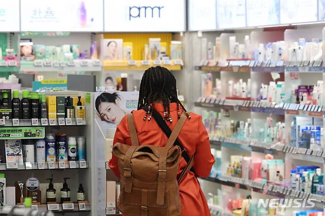 [서울=뉴시스] 권창회 기자 = 1일 오후 서울 시내 화장품 매장에서 외국인 관광객이 화장품을 둘러보고 있다. 한국무역협회에 따르면 지난 1∼2월 한국의 화장품 수출은 전년 동기보다 36.2% 증가한 15억 1500만달러로 집계됐다.2024.04.01. kch0523@newsis.com