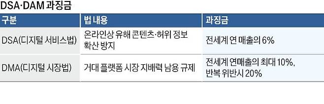 두 법은 과징금이 무겁다. DSA를 어기면 글로벌 연 매출의 6%가 과징금으로 부과되고, 유럽 시장 퇴출도 가능하다. DMA 위반은 연 매출의 최대 10%를 과징금으로 내야 한다. 반복적으로 위반하면 과징금은 20%까지 올라가고, 사안에 따라 기업 해체도 거론될 수 있다.