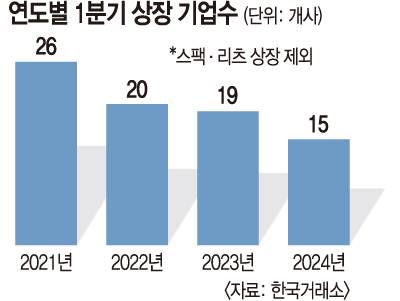 1일 한국거래소에 따르면 올해 1분기 국내 증시(코스피‧코스닥‧코넥스)에 신규 상장한 기업은 15곳(스팩‧리츠 제외)으로 집계됐다. 지난해 19곳보다 4곳 줄었다. 2022년(20곳), 2021년(26곳)보다도 낮다. 업계에서는 기술특례상장으로 지난해 코스닥에 상장한 반도체 팹리스 파두가 ‘뻥튀기 실적’ 의혹으로 시장에 충격을 준 영향 때문으로 분석하고 있다.