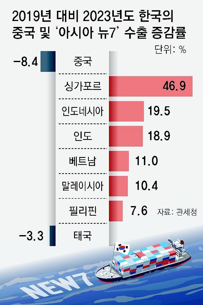 관세청에 따르면 2019년부터 지난해까지 4년간 대중(對中) 수출액은 8.4% 감소한 반면 ‘아시아 뉴(NEW) 7개국’ 대상 수출액은 15.6% 증가한 것으로 집계됐다. 싱가포르(46.9%), 인도네시아(19.5%), 인도(18.9%), 베트남(11.0%), 말레이시아(10.4%) 등 대부분이 두 자릿수 증가율을 기록했다.