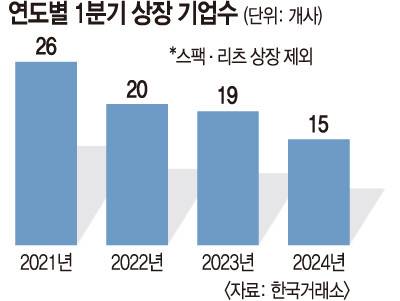 1일 한국거래소에 따르면 올해 1분기 국내 증시(코스피 코스닥 코넥스)에 신규 상장한 기업은 15곳(스팩 리츠 제외)으로 집계됐다. 지난해 19곳보다 4곳 줄었다. 2022년(20곳), 2021년(26곳)보다도 낮다. 업계에서는 기술특례상장으로 지난해 코스닥에 상장한 반도체 팹리스 파두가 ‘뻥튀기 실적’ 의혹으로 시장에 충격을 준 영향 때문으로 분석하고 있다.