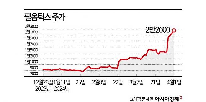 2일 금융투자업계에 따르면 필옵틱스 주가는 올해 들어 140% 올랐다. 지난해 말 1만원을 밑돌던 주가는 전날 장중 한때 2만4500원까지 올랐다. 지난해 7월13일 기록한 전고점 2만3300원을 8개월 만에 돌파했다. 시가총액은 5000억원을 넘어섰다.