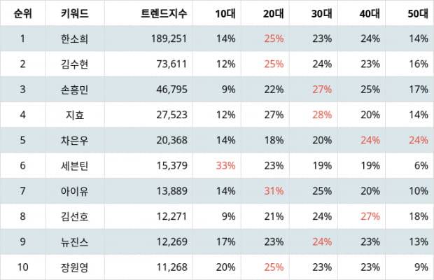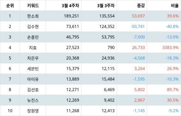 트렌드 지수 1위부터 3위까지 빅데이터로 조사한 결과, 한소희 블로그, 한소희 가방, 한소희 동생, 한소희 타투, 한소희 디올, 김수현 김지원, 김수현 드라마, 김수현 작가, 김수현 아나운서, 김수현 윤석민, 손흥민 이강인, 손흥민 문가영, 손흥민 연봉, 손흥민 김고은, 손흥민 엄마 등이 주목받는 연관 검색어로 나타났다.