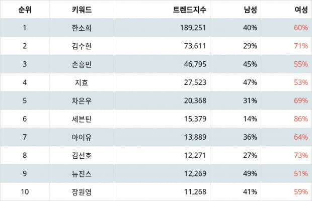 성별 선호도 분석 결과 1위 한소희는 남성 40%, 여성 60%, 2위 김수현은 남성 29%, 여성 71%, 3위 손흥민은 남성 45%, 여성 55%가 선호하는 것으로 나타났다.