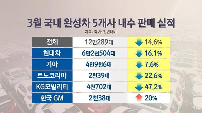지난달 국내 완성차업체 5곳의 내수 판매는 전년보다 14.6% 감소한 12만 289대로 집계됐습니다.