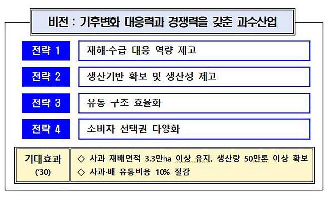 농식품부는 이상기후 현상이 잦아져 생산 감소 상황이 반복될 수 있다고 판단해 안정적인 국내산 과일 생산·유통 기반을 마련하고자 과수산업 경쟁력 제고 대책을 수립했다고 설명했습니다.