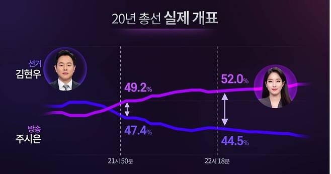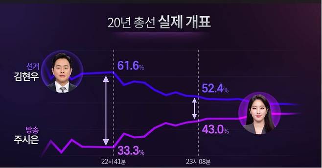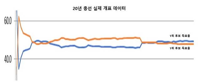 4년 전인 지난 2020년 총선 당시 서울의 49개 지역구 중 한 곳의 실제 개표 데이터 그래프입니다. 1위 김현우 후보와 2위 주시은 후보의 시간에 따른 득표율이 나타나 있습니다. 개표 초반 61.6% 대 33.3%로 28.3%포인트나 벌어져 있던 득표율차, 30여 분 사이에 9.4%포인트(52.4% 대 43.0%)로 급격히 줄어드는 게 보입니다. '추격자' 주시은 후보가 반 시간 동안 18.9%포인트나 따라붙은 겁니다. (28.3%-9.4%=18.9%p) 이 선거구의 최종 결과, 어떻게 되었을까요?