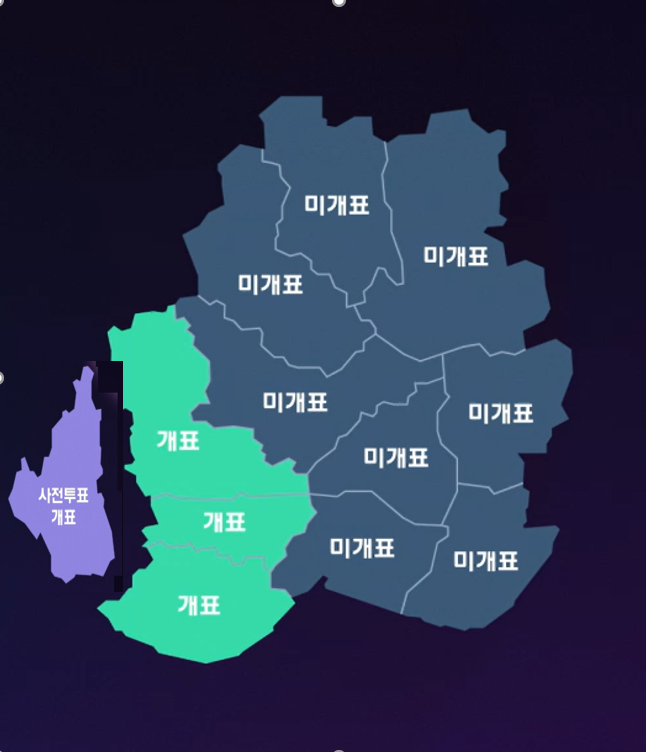 선거 개표는 '랜덤(무작위)의 미학'으로 볼 수 있습니다. 사진 속 11개 동으로 구성된 가상의 지역구에서 3개 동에서는 개표가 시작됐고 나머지 동에서는 아직 개표 전이라면, 한 개 선거구 내에서도 개표된 동의 표심이 먼저 드러나게 됩니다. 어느 동부터 개표가 되느냐, 이것은 '랜덤'입니다.
