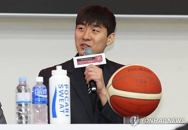 (서울=연합뉴스) 김성민 기자 = 창원 LG 양홍석이 2일 오전 서울 송파구 올림픽파크텔에서 열린 '2023-2024시즌 정관장 프로농구 플레이오프 미디어데이'에서 출사표를 던지고 있다. 2024.4.2
