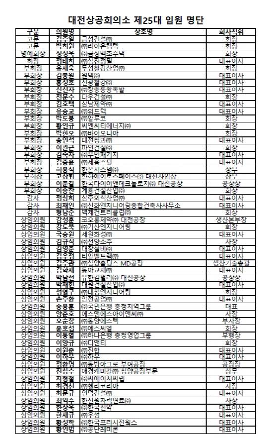 현재 대전상의 부회장엔 지역 대표 기업인 이승찬 계룡건설산업㈜ 회장을 비롯한 여성기업 신신자 ㈜장충동왕족발 대표이사, 벤처기업 박한오 ㈜바이오니아 회장, 공주지회 김숙자 ㈜우먼패키지 대표이사 등이 있다.