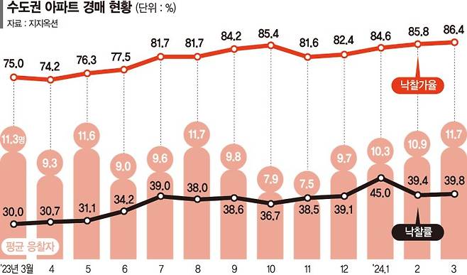 지난달 서울 아파트 낙찰가율은 87.2%에서 85.9%로 떨어진 반면 평균응찰자수는 2월 6.7명에서 지난달 8.1명으로 급증했다.