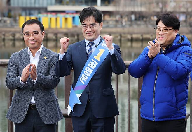 | 논란 휩싸인 후보들 두 자녀에 대한 ‘부동산 아빠 찬스’ 논란이 일고 있는 경기 화성을 공영운 후보가 지난달 6일 동탄호수공원에서 출마선언을 하기에 앞서 두 주먹을 불끈 쥐고 있다. 화성=연합뉴스 |
