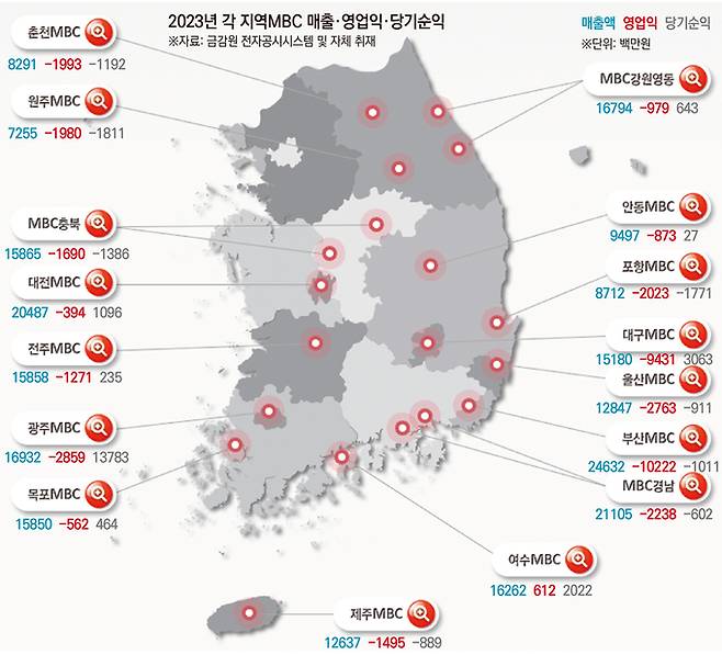 금융감독원 전자공시시스템 등에 따르면 지난해 지역MBC 대부분은 영업적자를 기록했다. 여수MBC만 유일하게 6억원 흑자를 봤고, 다른 지역MBC들은 많게는 100억원에서 적게는 4억원까지 영업손실을 냈다. 부산MBC와 대구MBC가 각각 102억원, 94억원으로 가장 큰 폭의 영업적자를 냈고, 광주MBC(-29억원), 울산MBC(-28억원), MBC경남(-22억원) 등도 20~30억원 가량의 영업손실을 기록했다.