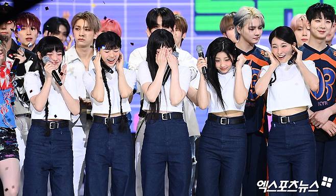 이날 더쇼에 참석한 아일릿이 더쇼 초이스 발표 때 폭죽 소리에 깜짝 놀라고 있다.