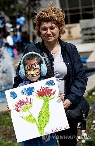epa11255568 Daria (L), 8, a Romanian girl suffering from autism, accompanied by her mother Mihaela (R), poses with her handmade painting during the 'Blue Festival', an event dedicated to the World Autism Awareness Day, in Obor Park, Bucharest, Romania, 02 April 2024. Dozens of children suffering from autism, accompanied by their relatives and friends and helped by volunteers, have participated in various games, painting and face painting workshops, skills and other activities organized by the NGOs Help Autism, Autism Romania, National Association for Children and Adults with Autism from Romania, Romanian Association of Therapies in Autism and ADHD under the slogan 'Not invisible!', to raise awareness among communities regarding autistic people in Romania. According to the World Health Organization (WHO), it is estimated that about 1 in 100 children is diagnosed with autism worldwide. World Autism Awareness Day, established by the United Nations General Assembly in 2007, is observed annually on 02 April. EPA/ROBERT GHEMENT