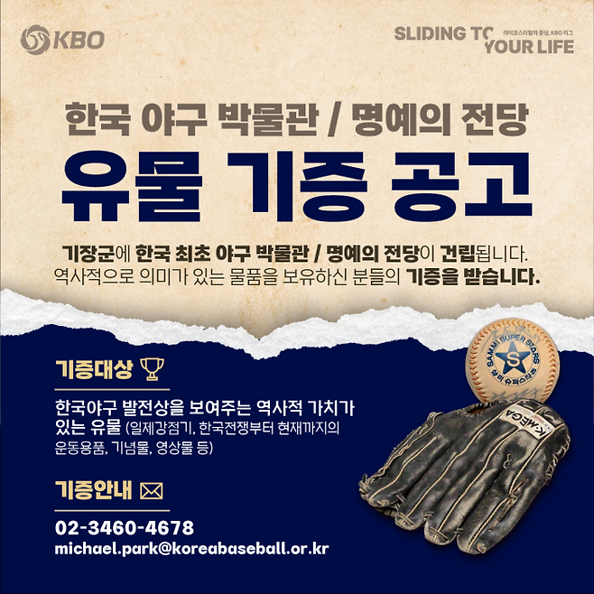KBO는 2026년 완공 예정인 기장 야구박물관, 명예의 전당을 야구인, 팬들과 함께 만들어가기 위해 야구 유물을 기증받는다.