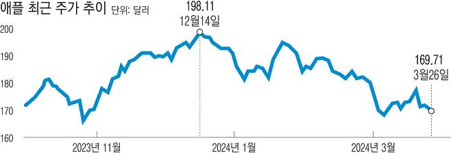 매출 비중이 높은 중국 내 아이폰 판매량은 올해 첫 6주 동안 전년 동기 대비 24% 줄었다. 시장 점유율은 1년 새 19%에서 15.7%로 떨어져 순위도 2위에서 4위로 밀렸다. 이 와중에 자율주행 전기차 ‘애플카’ 출시 계획을 접었다는 소식은 미래 먹거리를 포기했다는 의미로 읽혔다. 지난 2월 확장현실(XR)을 구현하는 헤드셋 ‘비전프로’가 나왔지만, 워낙 고가여서 당장 판매량을 끌어올리기 어렵다는 분석이 많다.