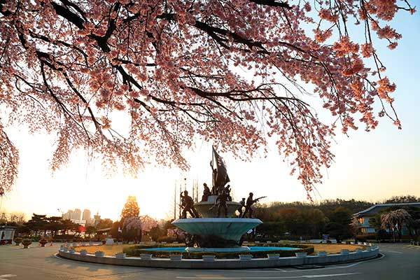 정문에서 겨레얼마당을 지나 현충탑 뒤편까지 흐드러지게 핀 수양벚꽃의 분홍 물결로 뒤덮인다. 수양벚나무의 아름다움은 봄바람 부는 날, 더 향긋하게 다가온다. 꽃잎을 주렁주렁 매단 가지가 바람에 하늘거리며 운치를 더한다.