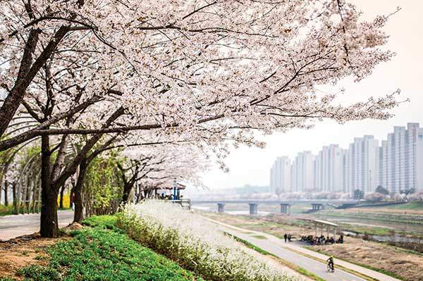 여유로운 둑길을 따라 벚나무가 심어져 있어, 일조량이 충분해 매년 풍성하게 만개한 벚꽃을 볼 수 있다.