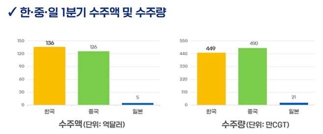 또 지난해 수주액(299억 달러)의 45.5%가량에 해당하며 분기별 기준으로 우리나라 선박 수주액이 세계 1위를 달성한 것은 2021년 4분기 이후 3년 만이다.