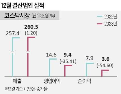 3일 한국거래소에 따르면 코스닥시장 12월 결산법인 1146개사(연결기준)의 지난해 매출 합산액은 260조4556억원, 영업이익 합산액은 9조4077억원, 순이익 합산액은 3조5845억원으로 각각 집계됐다. 매출액은 전년대비 1.2% 늘어난 반면 영업이익과 순이익은 35.4%, 54.6%씩 줄었다. 영업이익률은 2022년 5.66%에서 작년 3.61%로 쪼그라들었다.