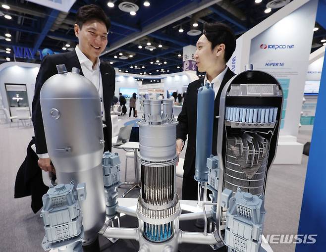 [서울=뉴시스] 김진아 기자 = 3일 서울 강남구 코엑스에서 열린 코리아스마트그리드엑스포 원전 수출 특별관에서 두산에너빌리티 관계자가 원자력 주기기 등에 대한 설명하고 있다. 이번 전시회는 에너지스토리지(ESS)산업전, 분산에너지산업전, 전기차충전인프라산업전 등 3개 특별관으로 구성됐으며, 스마트그리드·전력 신산업 분야 신기술과 제품을 한 눈에 볼 수 있다. 2024.04.03. bluesoda@newsis.com
