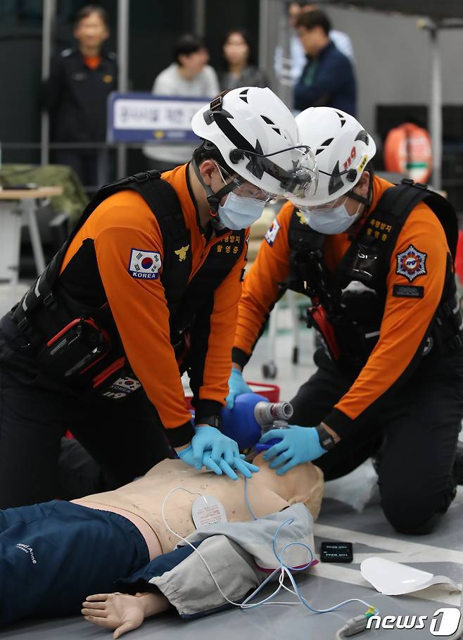 (대전=뉴스1) 김기태 기자 = 3일 대전소방본부 구급교육센터에서 열린 소방기술경연대회 구급분야에 대원들이 경연을 펼치고 있다. 2024.4.3/뉴스1