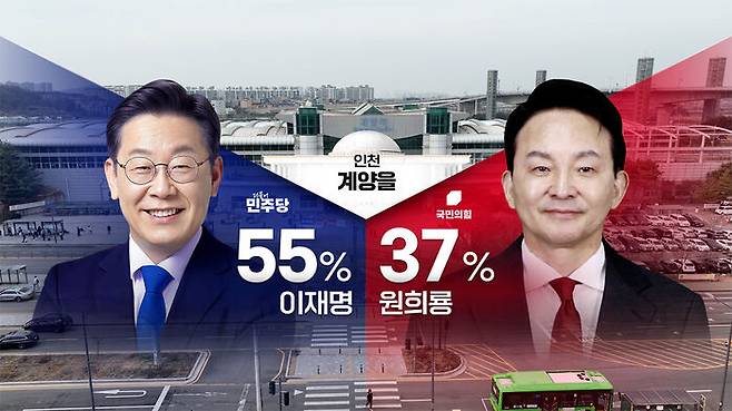 내일이 총선 투표일이라면 누구에게 투표하겠느냐고 물었더니 민주당 이재명 후보 55%, 국민의힘 원희룡 후보 37%로 이 후보가 오차 범위 밖에서 앞서는 것으로 나타났습니다.