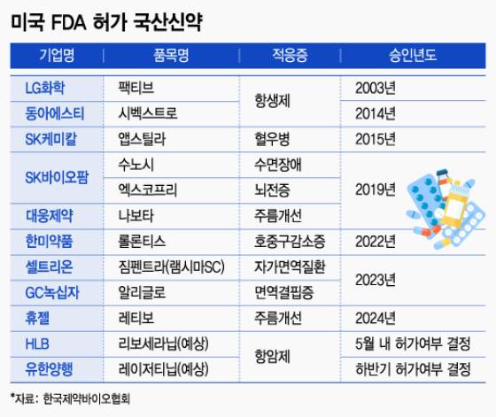 지난 2003년 LG화학이 항생제 '팩티브'로 국산 신약 중 처음으로 FDA 신약 허가를 받은 뒤 지난해까지 FDA 신약허가를 받은 국산 신약은 총 9개다. 적응증 역시 혈우병과 수면장애, 뇌전증, 호중구감소증 등 희귀난치성 질환부터 자가면역질환과 주름개선까지 영역을 확대해왔다.