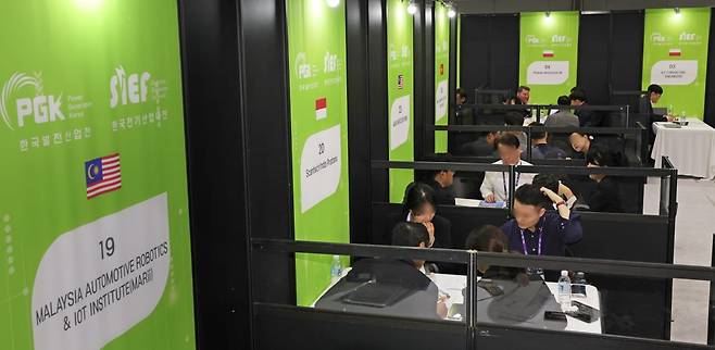 한 관람객이 한국중부발전·한국지질자원연구원 부스를 지나가고 있다.