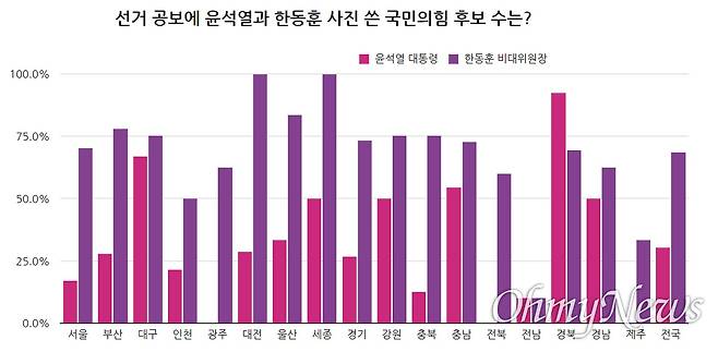특히 한 위원장 사진은 영남권뿐 아니라 수도권과 호남권, 충청권에서도 사용 비율이 높았습니다. 대전(7명)과 세종(2명)에서는 모든 국민의힘 후보가 한동훈 사진을 사용했고, 서울(33명, 70.2%)과 경기(44명, 73.3%), 충북(6명, 75.0%), 충남(8명, 72.7%) 등의 사용율도 70%를 넘겼습니다. 호남권도 전남(10.0%)에서 1명에 그쳤을 뿐, 광주(5명, 62.5%), 전북(6명, 60.0%)도 60%가량이 한동훈 사진을 썼습니다.