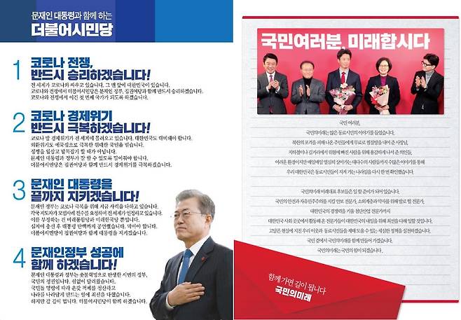 | ▲ 21대 총선 당시 더불어민주당 비례위성정당인 더불어시민당 선거공보(왼쪽)과 22대 총선 국민의힘 비례위성정당인 국민의미래 선거공보. 문재인 대통령을 전면에 내세운 더불어시민당과 달리 국민의미래 선거공보에서는 윤석열 대통령 모습을 찾아볼 수 없다. |