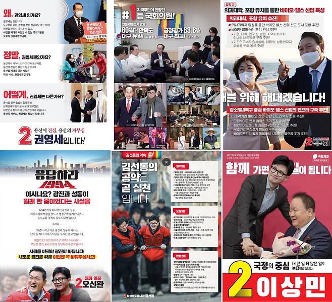 | ▲ 윤석열 대통령(위쪽)이나 한동훈 국민의힘 비상대책위원장(아래) 사진을 사용한 제22대 총선 국민의힘 지역구 후보 선거 공보. |