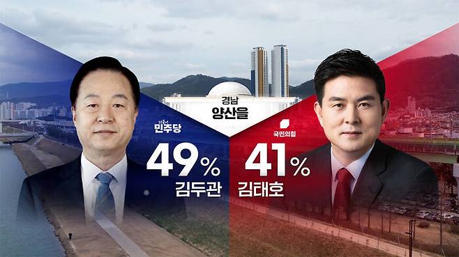 이곳에서는 민주당 김두관 후보 49%, 국민의힘 김태호 후보 41%로, 오차 범위 안에서 두 후보가 접전을 벌이고 있는 걸로 나타났습니다.
