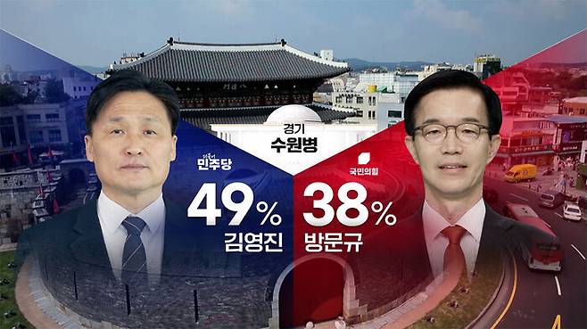 민주당 김영진 후보 49%, 국민의힘 방문규 후보 38%로 김 후보가 오차 범위 밖에서 앞서는 것으로 나타났습니다.