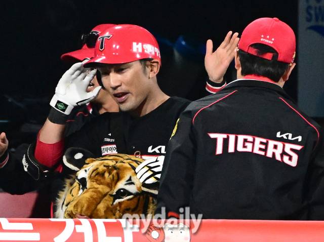 [마이데일리 = 유진형 기자] 3일 오후 경기도 수원KT위즈파크에서 '2024 신한 SOL Bank KBO리그' KIA 타이거즈와 KT 위즈의 경기가 열렸다. KIA 서건창이 4회초 2사 1루서 2점 홈런을 친 뒤 동료들의 축하를 받고 기뻐하고 있다.